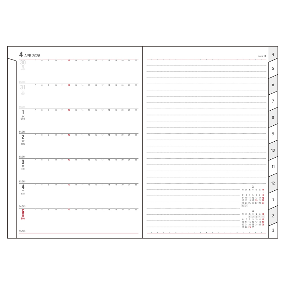 左半分が1週間のスケジュール、右半分が横罫のメモスペースで、1週間の予定とメモを見開きで管理できる1番人気のレイアウトです。