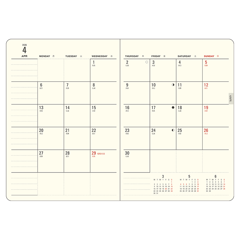マンスリーには前月・翌月・翌々月のミニカレンダーがついています。4ヶ月が見通せます。