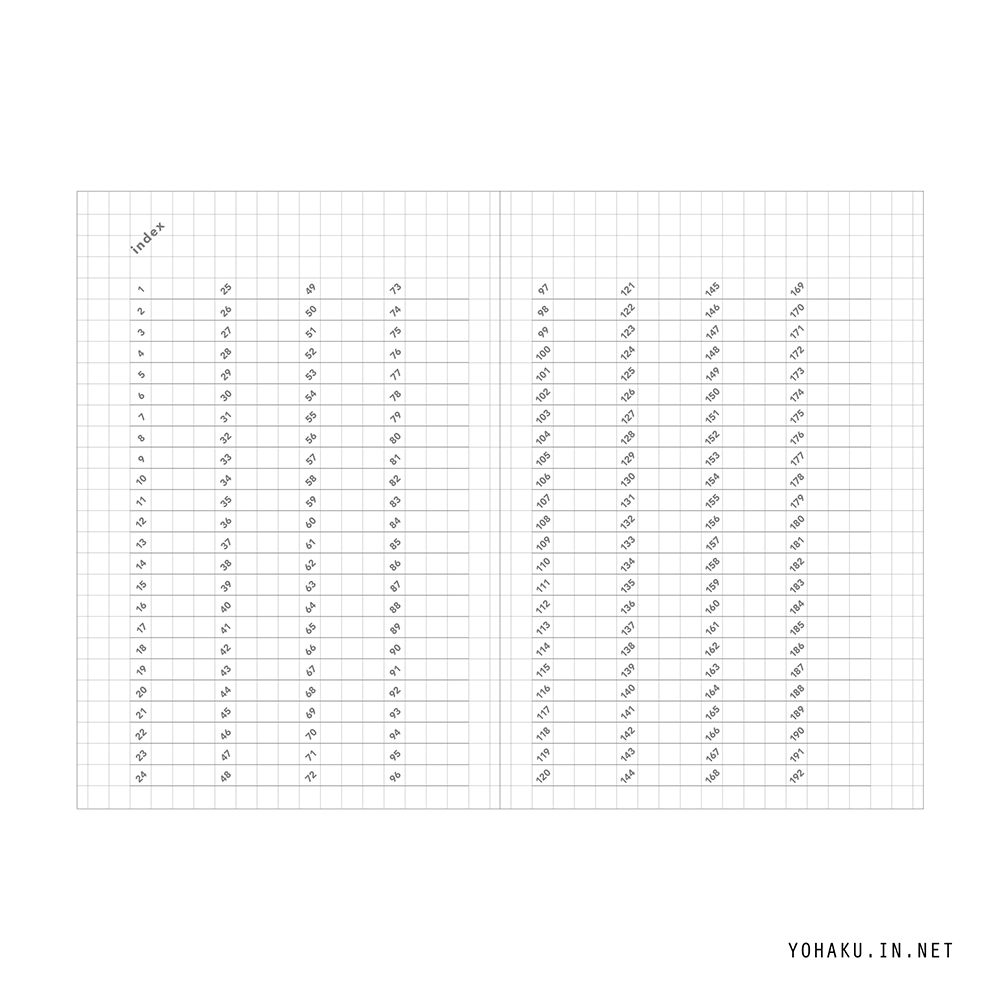 ・ページごとのタイトルを巻頭のインデックスに記録すると後から検索できます。 ・ページ番号がななめなので、タテヨコどちらでも使えます。5ミリ方眼で使いやすいレイアウトです。