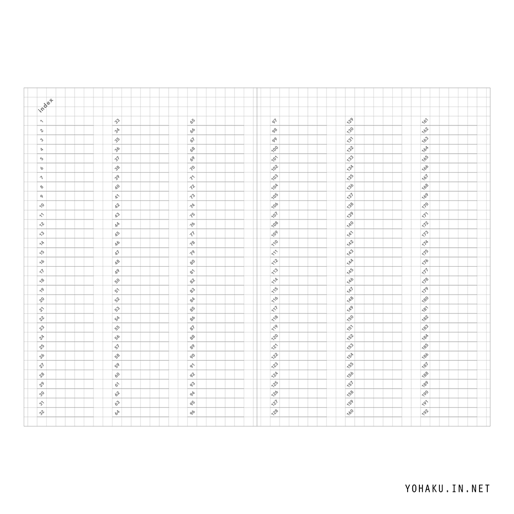 ・ページごとのタイトルを巻頭のインデックスに記録すると後から検索できます。 ・ページ番号がななめなので、タテヨコどちらでも使えます。5ミリ方眼で使いやすいレイアウトです。