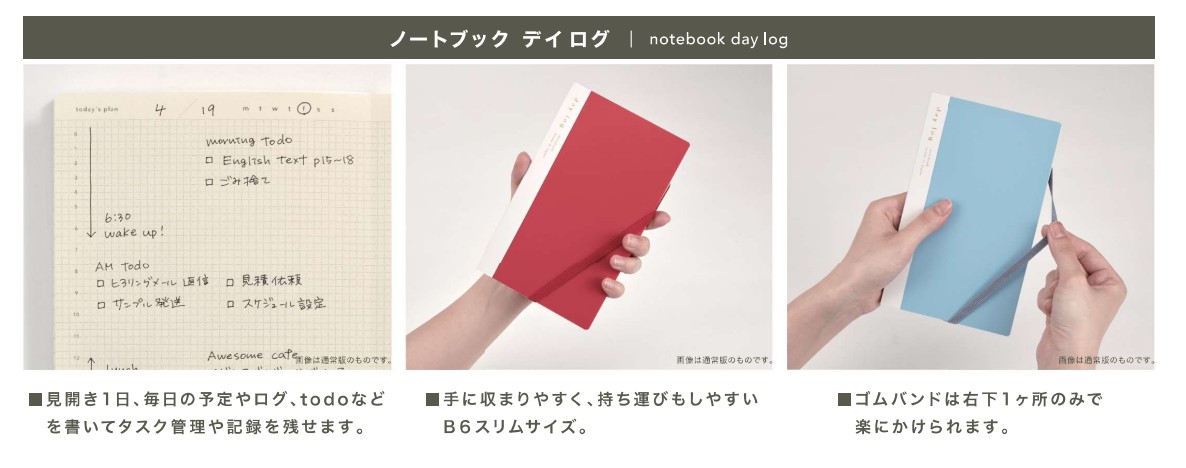 ・見開き1日、毎日の予定やログ、todoなどを書いてタスク管理や記録を残せます。 ・1冊で3ヶ月分。ライフログをやってみたい方も気軽に始められます。 ・手に収まりやすく、持ち運びもしやすいB6スリムサイズ。 ・ゴムバンドは右下1ヶ所のみで楽にかけられます。カバンに入れても表紙が開きません。