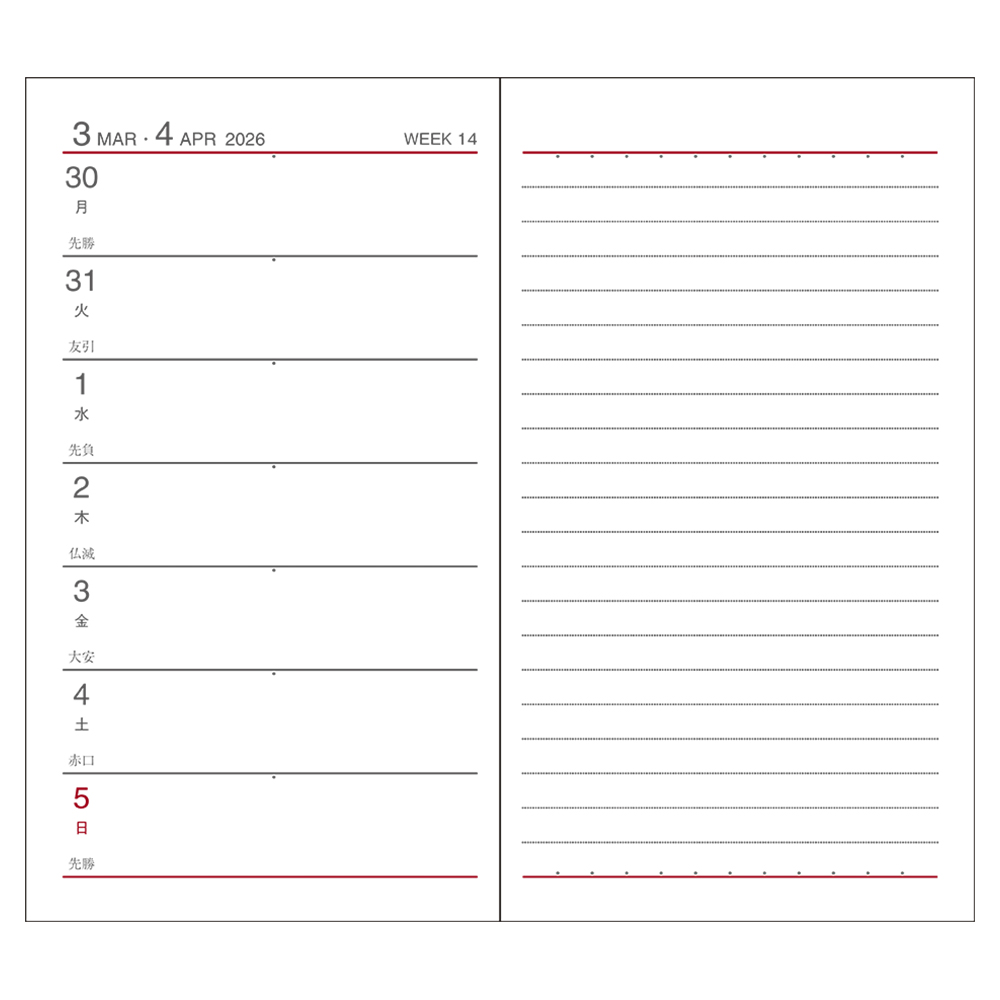 左半分が1週間のスケジュール、右半分が横罫のメモスペースで、1週間の予定とメモを見開きで管理できる1番人気のレイアウトです。