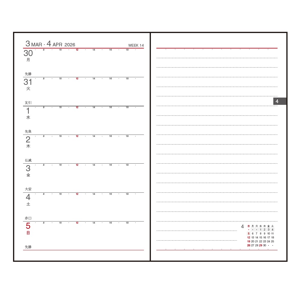 左半分が1週間のスケジュール、右半分が横罫のメモスペースで、1週間の予定とメモを見開きで管理できる1番人気のレイアウトです。